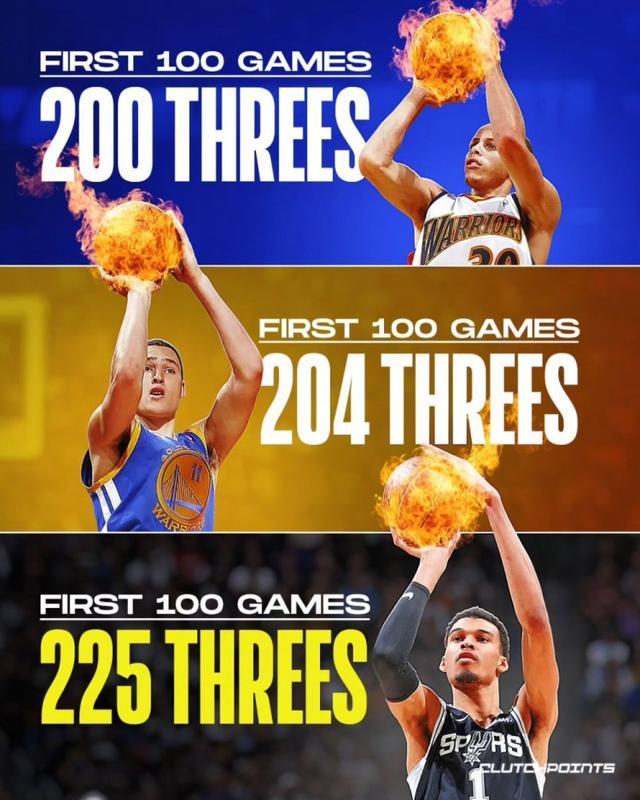 直播吧9月22日訊 美媒Clutch Points曬出一張文班、庫(kù)里還有克萊的生涯前100場(chǎng)比賽三分球的命中總數(shù)圖。其中庫(kù)里生涯前100場(chǎng)進(jìn)了200個(gè)三分,而克萊是204個(gè),而文班作為內(nèi)線投中