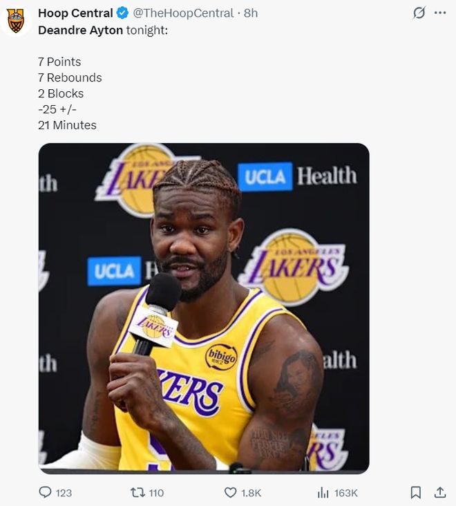 全場比賽21分鐘,8中3,拿到7分7籃板2蓋帽1失誤,正負值-25,命中率37.5%,就面對勇士這套矮子陣容命中率都可以不過50%令人無奈。