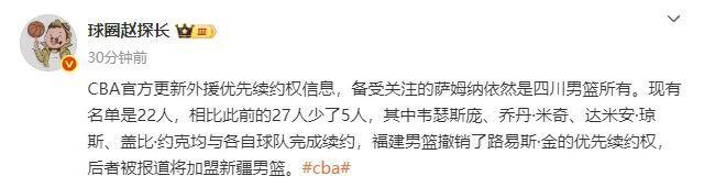 在這一段時間里,有關(guān)廣東男籃拿到外援薩姆納簽約權(quán)的消息比比皆是,甚至就連知名媒體人“江南的城”也透露過此類消息,表示廣東男籃已經(jīng)順利拿到了薩姆納的簽約權(quán)。不過就在日前