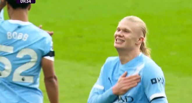 比賽開始僅僅8分鐘,格瓦迪奧爾后場長傳,哈蘭德扛住后衛(wèi)之后左腳勁射破門,1比0!在各項賽事里,哈蘭德連續(xù)7場進球,共打入10球。