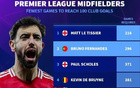 8位中場(chǎng)為英超球隊(duì)打進(jìn)百球:丁丁、雙德在列,B費(fèi)所用場(chǎng)次第二少